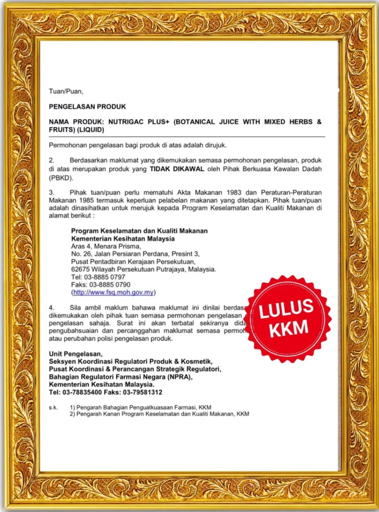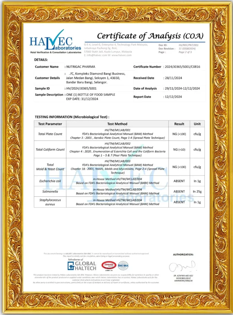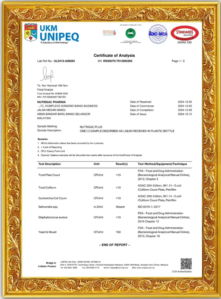 Nutrigac Plus+ Telah Melalui Ujikaji Makmal dari UKM Unipeq, Halvec & Mendapat Kelulusan dari KKM