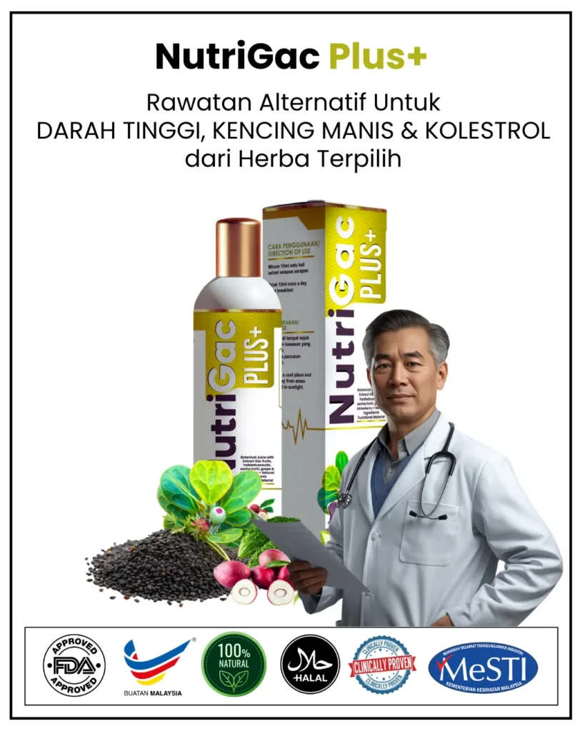Bukan. Nutrigac Plus+ bukan ubat, tapi minuman herba semula jadi yang membantu menyokong kesihatan dalaman — khususnya kawalan tekanan darah, paras gula dan kolesterol.