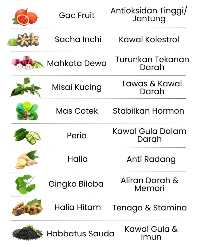 Diformulasi khas dengan 10 ekstrak herba semula jadi membantu Melancarkan Peredaran Darah, Mengawal Paras Gula & Kolestrol, Serta Menguatkan Saraf dan Tenaga Dalaman