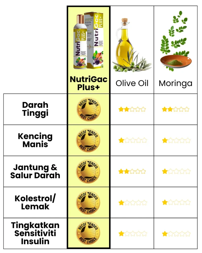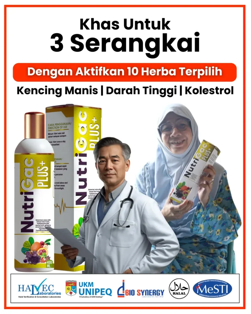 Keberkesanan Nutrigac Plus+ disokong oleh formulasi herba semula jadi yang telah dikaji secara saintifik — termasuk Gac Fruit, Sacha Inchi, dan Misai Kucing yang terbukti bantu kawal tekanan darah, paras gula & kolesterol.