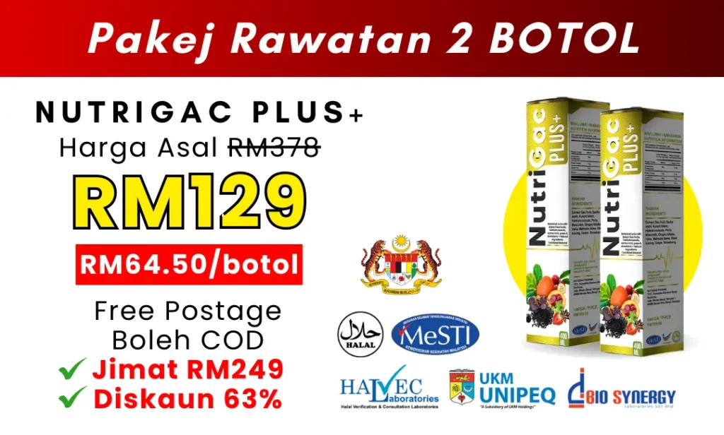 Tiada. Nutrigac Plus+ diformulasikan daripada 100% bahan semula jadi seperti Gac Fruit, Sacha Inchi & Misai Kucing. Tiada bahan terlarang atau sintetik — selamat diamalkan jangka panjang.